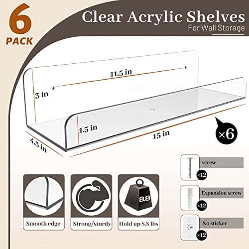 【6 pack 15-inch acrylic wall shelves】It provides multiple levels of storage, allowing you to use space more efficiently. It’s easy to install and bear 8.8 pounds for your book, CD and funko pop. You can put these clear floating shelves to any room for decoration.