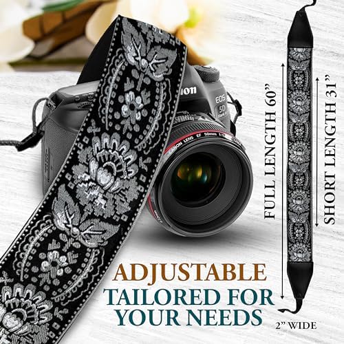 Camera Strap for All DSLR and Mirrorless Camera Including Binoculars. Embroidered Silver & Black Woven Camera Strap Universal Neck Crossbody & Shoulder Camera Strap, Gift for Photographers