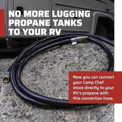 Say goodbye to lugging propane tanks to your RV. Now you can connect your Camp Chef stove directly to your RV’s propane with this connection hose.