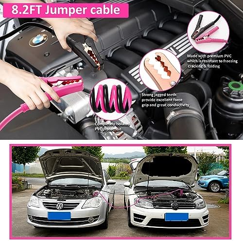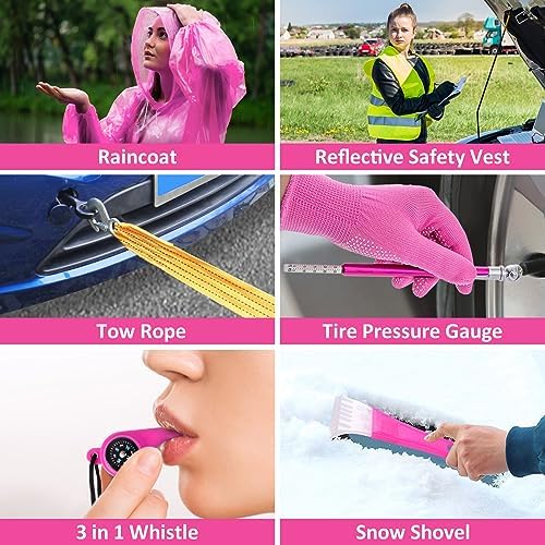 💗ROAD SAFETY GUARANTEE: Our roadside emergency kit contains all emergency accessories, like pink jumper cable, tow rope, safety hammer, and more women’s emergency essential tools