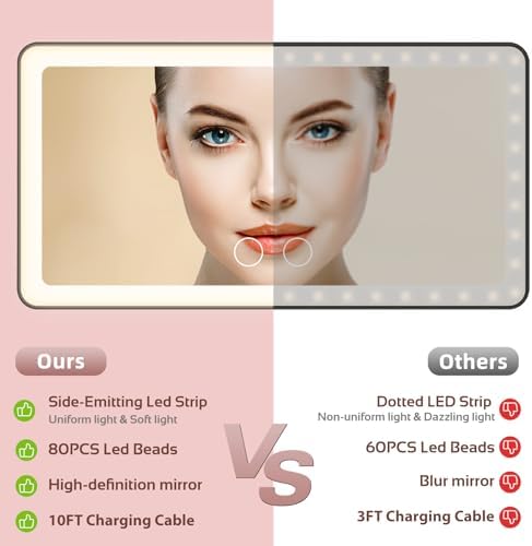 👍【Latest Upgrade】- Upgraded uniform and glare-free LED light bars more natural and soft, bright but not dazzling, protecting your eyes.The light is even on your face,so you can see more realistically how your makeup looks. No more makeup disaster!