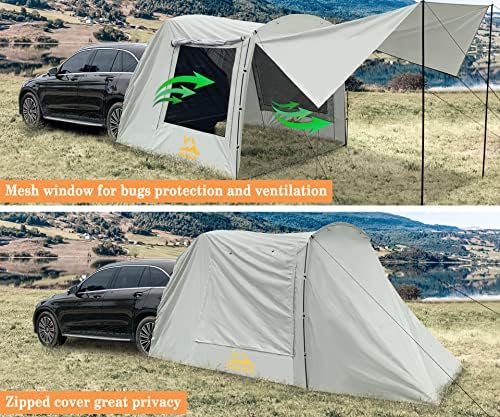 Private Room:Zipped down the rainfly,the SUV tent will be a fully closed structure,create a private room to keep you completely dry in bad weather.You could also open the extended flap of the mesh window for air and good view.