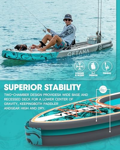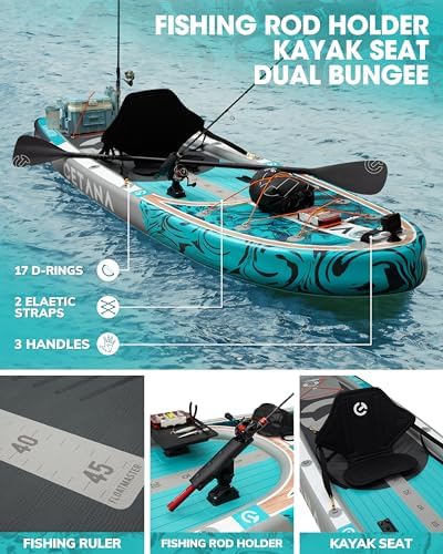 【FISHING-READY PADDLEBOARD】Elevate your fishing experience with Cetana’s inflatable paddleboard set. Equipped with a fishing rod holder, universal mount, and other angling gear, this board is ready for your next big catch. Fifteen D-rings provide ample attachment points for most fishing accessories, ensuring you have everything you need for a successful day on the water. Enjoy a seamless fusion of paddling and fishing with this versatile and well-equipped board.