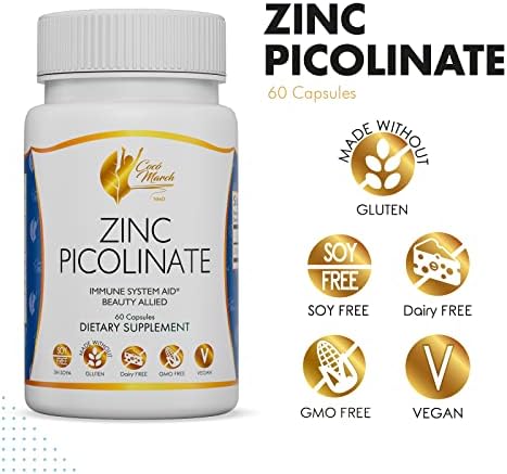 Coco March Zinc Picolinate – Immune System Aid, Beauty Ally, Bio-Available Form for High Absorption – Gluten Free, Soy Free, Dairy Free, GMO Free, Vegan – 60 Servings