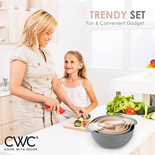 Set Includes two mixing bowls (insert size of mixing bowls), one colander/strainer, one fine-mesh sieve/sifter, and four measuring cups- including sizes 1 cup, 1/3 cup, 1/2 cup, and 1/5 cup for a variety of uses.