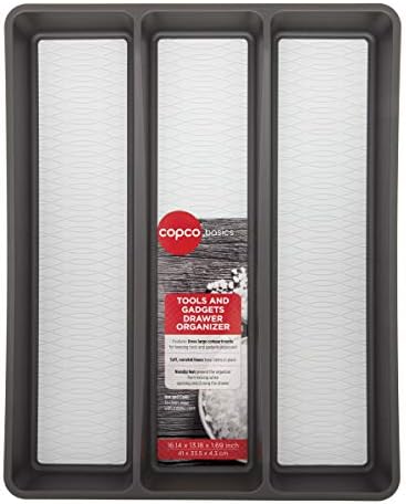 The Three Compartment Drawer Organizer in Charcoal Gray by Copco Basics keeps your kitchenware, office supplies, and more organized and easily accessible. The nonslip liner prevents items from moving around in your drawer, which protects them from damage. Features nonslip feet to keep organizer in place when opening and closing drawer. Use in the kitchen or in any room throughout your home to keep various items separated and easy to find. Fits most standard-sized drawers. Wipe clean with a damp cloth. Measures 15.75″ L x 12.8″ W x 1.67″ H.