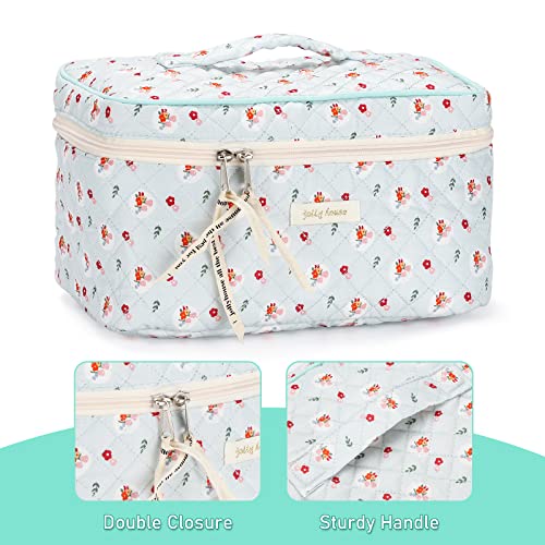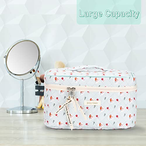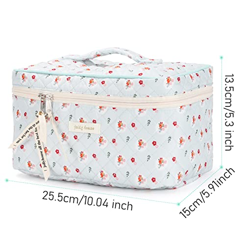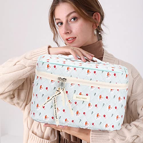 Cotton Makeup Bag, Quilted Cosmetic Bag with Handle Large Capacity Travel Toiletry Bag for Women Cute Aesthetic Floral Makeup Bag (Blue)