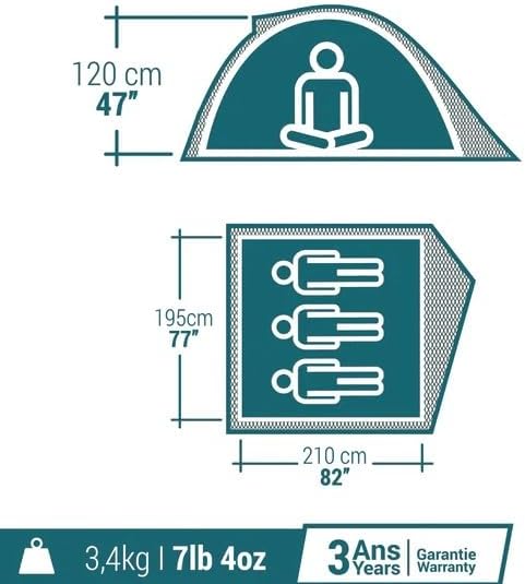 Decathlon Quechua MH100, Outdoor, Waterproof Family Camping Tent, 3 Person. Simple and easy-to-pitch three-person tent, to protect you from the elements. The advantage? Throughout the hot day, stay cool with our Fresh and Black technology that reflects rays of light keeping your tent 99% Dark. It contains 2 top vents and an additional 2 mechanical side ventilation points. Decathlon tests all of our tents in a Wind tunnel on a turntable, a properly pitched tent can exceed winds up to 25 mph! Keeping you warm on the windiest of nights. The free-standing dome structure means you can move it around to find the perfect location. Waterproofing All Quechua tents are validated in a laboratory (whole tent under 200 L/hour for 3 hours) and the field. (2000-mm rated PU-coated polyester flysheet, 120g/sqm polyethylene groundsheet, all seams are sealed with thermo-bonded tape). A breathable polyester bedroom under the flysheet means you don’t come into contact with the condensation that forms naturally on the inside of the flysheet. Water column (Schmerber): Flysheet > 2000 mm. Groundsheet > 5000 mm. Wind Resistance We test all our tents in a wind tunnel on a turntable to expose each side of the tent to the wind. A properly pitched tent with all guy ropes fitted around the tent must remain habitable in wind speeds up to 25 Mph near the ground (Force 5). Withstands 25 Mph winds (Force 5): validated in wind tunnels on a rotating plate. Capacity 77.5″ X 82.6″ Bedroom. Max. useful height: 45.6″. Darkness Technology Fresh & Black is a technology patented by Decathlon that allows us to reflect the sun’s rays and insulate from the light thanks to specific materials. This reduces the sensation of heat in the tent and makes it darker. Fresh & Black patented exterior fabric: 99% darkness even in broad daylight. Fresh & Black technology keeps the inside of your tent cooler and darker for a more comfortable night’s sleep. To get the most out of this technology, don’t forget to ventilate your tent at night! Ventilation 2 top vents. 2 mechanical side ventilation points. Space between the flysheet and the ground all around the tent. To allow the air to circulate between the sleeping area and the flysheet, to refresh the air, and limit as much as possible the natural phenomenon of condensation. The Fresh technology reduces the sun’s heat. Product Composition Pole 100% Glass – Fiber Inside room 55% Polyethylene, 45% Polyester Double roof 85% Polyester, 15% Polyurethane – Coating Carry bag 100% Polyester. Pitching and striking the tent This tent has a classic dome structure. All you have to do is fit the tent poles with the bedroom, followed by the upper tent pole, and finish by fitting the flysheet on the top. To pack up the tent, the process is the same, but in reverse. Stock Advice Storage After use or cleaning, wait until the tent is perfectly dry before putting it away in avoid bad smells and mold. Warranty of your tent This camping tent was designed for occasional outdoor use (4 weeks per year) during your camping trips or in the countryside. Continuous exposure to UV light over several weeks can damage the textile part. Our tents do not belong to the category of “garden furniture” and are not designed to be kept outdoors permanently. To maximize the lifetime of your tent, it’s important to store it properly when it is not being used. 5-year warranty.