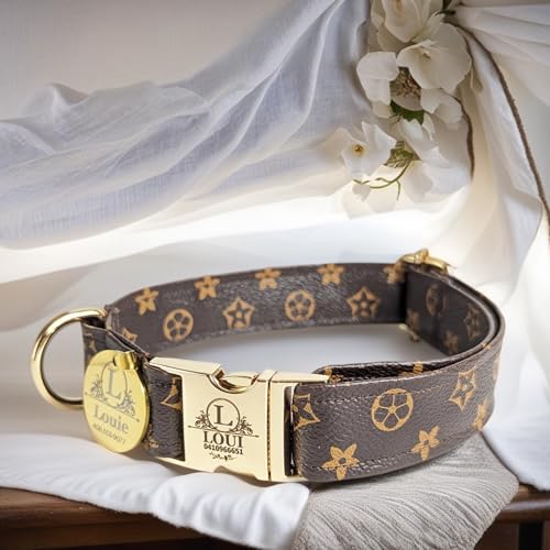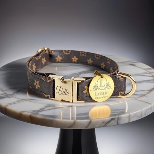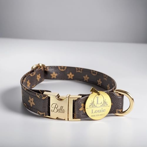 Designer Dog Collar – Leather -Small – Large – Personalized Engraved Name (Small, Brown)