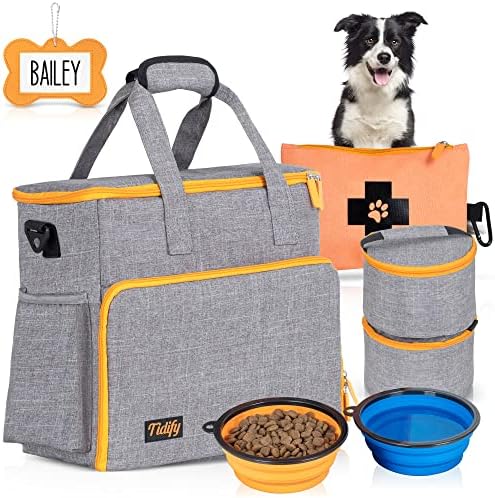 Dog bags for traveling includes: 1 Dog Tote bag , 2 Dog Food carriers bag , 2 EASY TO CLEAN Pet Silicone collapsible bowls , first aid kit pouch , Front Large pocket that opens to a Water-Resistant Placemat (WOW!!) , BLANKET STRAPS and multiple pockets with detachable divider