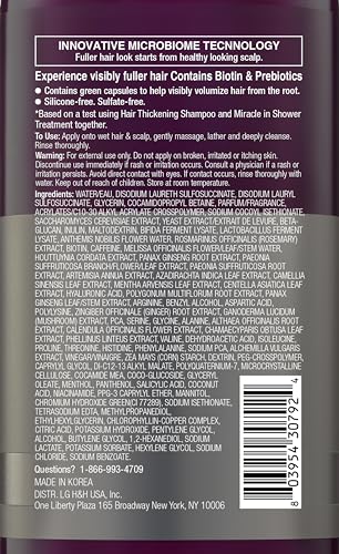 Clinically proven: in 5 seconds, hair smoothness improved by 89%*; in 2 weeks, scalp hydration improved by 169%**; In 2 weeks, reduced buildup that can clog scalp pores by 76%** Clinically proven: 100% of subjects showed measurable improvement in visible scalp redness from dry skin** *Based on a clinical test of 30 hair tresses using Miracle in Shower Treatment. **Based on a clinical test on 22 subjects using Hair Thickening Shampoo and Miracle in Shower Treatment together.