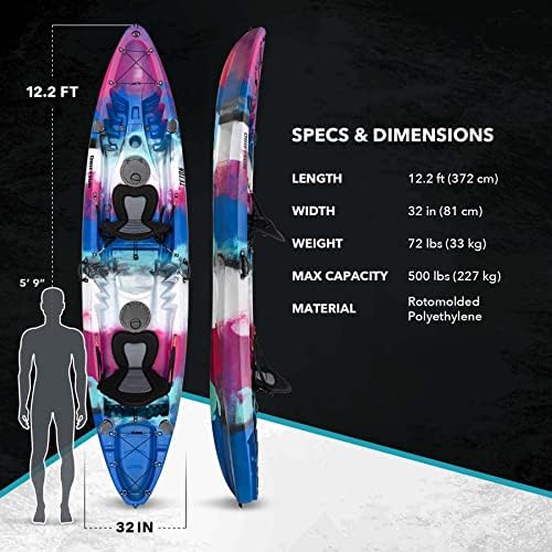 Recreational Tandem Kayak – 12’2ft 2 Person Kayak is perfect for Fishing, Travel, or Family Recreation – 500 pound weight capacity can accommodate two paddlers + center seat for child, dog or solo paddling.