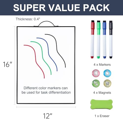 CONTAINS EVERYTHING YOU NEED – This dry erase whiteboard kit includes a 16×12-inch presentation board, 4 cute magnets, 1 eraser, and 4 markers. It comes with everything you need. Enjoy the portable whiteboard as soon as you receive it!