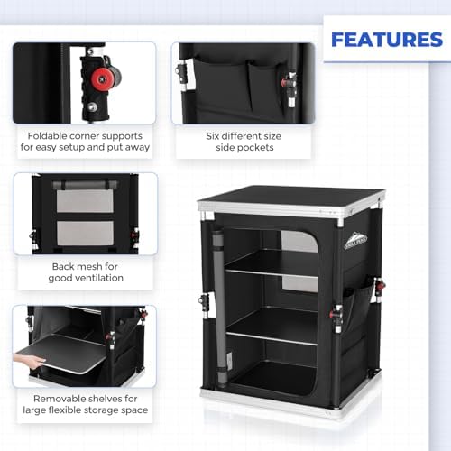 EAGLE PEAK Outdoor Folding Camping Table with Large 3-Tier Storage Organizer and Side Pockets, Easy Set Up Portable Aluminum Camping Kitchen, Black