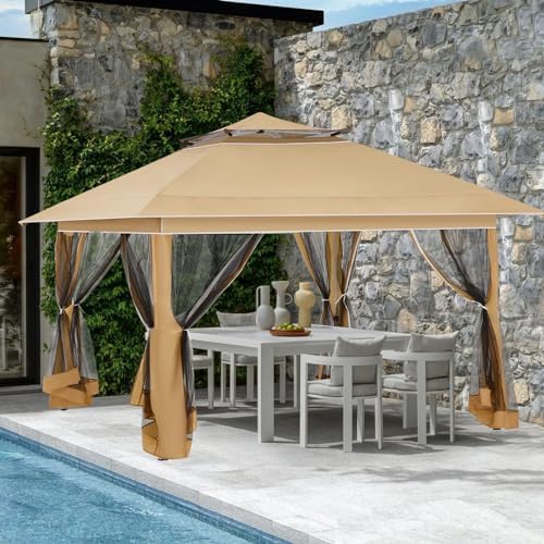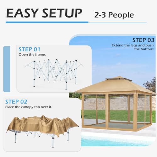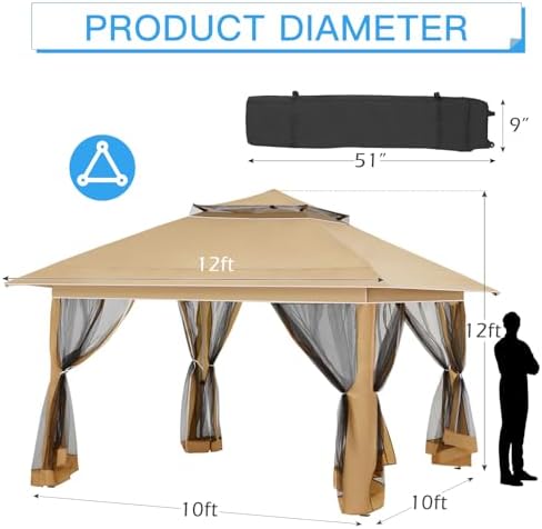 ECOTOUGE 12×12 ft Pop Up Canopy Tent, Instant Shelter Canopy with Mesh Screen Sidewalls and Carrying Roller Bag, Outdoor Party Canopy Tent with Waterproof and UV Resistant (Khaki)