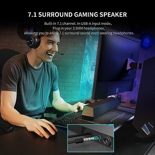 【7.1 SURROUND GAMING SPEAKER】Built-in 7.1 channel. DSP sound card chip. Edifier Gaming Center7.1 surrounding sound effect together create a more immersive experience. Intelligent noise cancellation and crystal-clear sound quality. Included 3.5 mm headphone jack, these are the soundbar you’ve been looking for.
