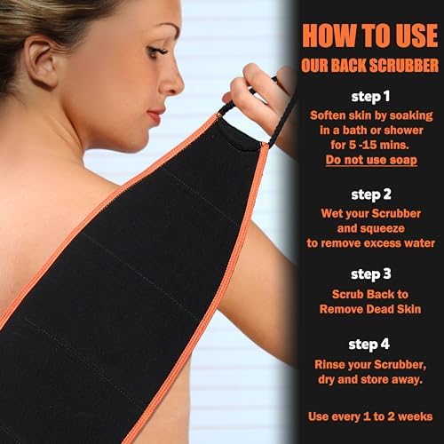 Using our back exfoliator – Soften skin with warm water for about 5 to 10 minutes, wet the scrubber and quickly scrub for super smooth healthy skin