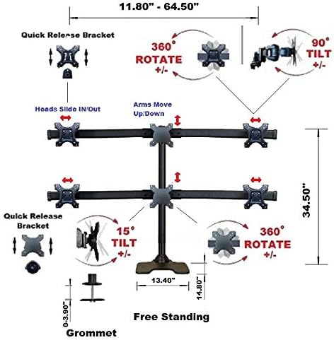 HEIGHT ADJUSTIBILITY – Monitor viewing height can be easily adjusted by moving the arms along the Pole with pre-drilled holes. The height of each monitor can be individually fine tuned +/- 0.5″ for a total approximately 1″ Up/Down