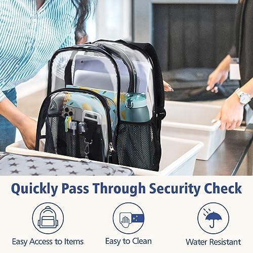 F-color Heavy Duty Clear Backpack Helps you quickly get through the security, Get easier to reach in to grab what you need, Easily have a quick double check before you go out in case of forgetting things Material: 0.5mm Transparent PVC;1680D Waterproof Oxford Fabrics Recommended age grade: above 12years oldReinforced Padded StrapsBar-tacked at the end to reinforce its load bearing and adds its durability;Straps padded with foam provide you with comfortable wearing experience;Front Pocket: special pouch for pencils and cellphones;Side mesh Pocket: perfect for water bottle or umbrella;Side zipped pocket: designs to hold small items, pencil cases, etc; Wide ApplicableThis transparent backpack is wide applicable in most occasions such as school, work, travel, parks, stadiums, carnivals, etc;Perfect for Junior or Senior teens, boys, girls, or adults.