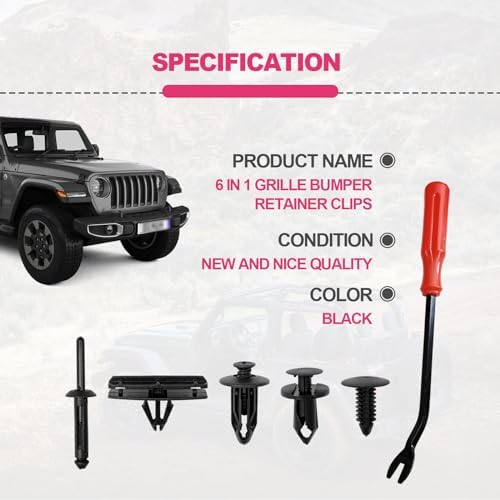 Be the first to review “Fit for Wrangler Ram Push-Type Plastic Rivets 6 in 1 Grille Bumper Retainer Clips with Fastener Remover OEM 6506007AA, 6502625, 6503598 (121PCS)”