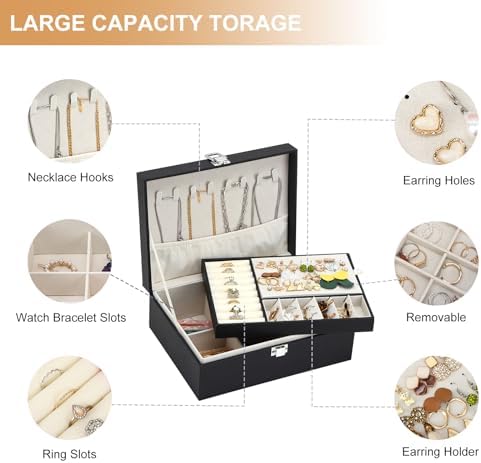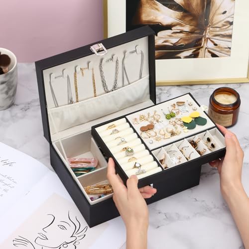 Fixwal Jewelry Box for Women, 2-Layer Jewelry Organizer with Removable Tray for Display Earrings Rings Necklaces, Jewelry Case, Black