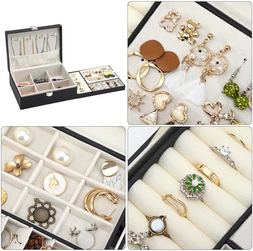 [No More Annoying Tangles for Your Jewelry] The jewelry organizer box with black leather looks elegant and stylish. The soft velvet interior protects your precious jewelry and makes your jewelry feel more luxurious. The top compartment has small tabs to hold your necklaces in place and prevent them from getting tangled together.