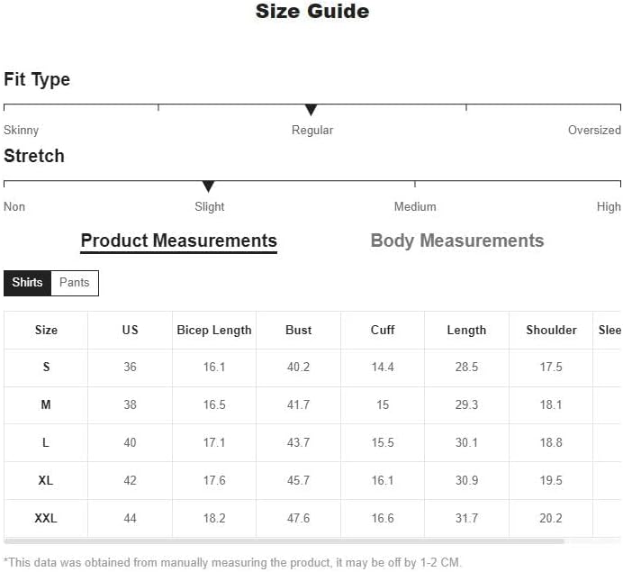 Size Chart: Pants: Small:Length:17.9″, Waist Size:30.7″, Hip Size:41.3″, Thigh:26.7″/ Medium:Length:18.3″, Waist Size:32.3″, Hip Size:42.9″, Thigh:27.6″/ Large:Length:18.7″, Waist Size:34.3″, Hip Size:44.9″, Thigh:28.6″/ X-Large:Length:19.1″, Waist Size:36.2″, Hip Size:46.9″, Thigh:29.7″/ XX-Large: Length:19.5″, Waist Size:38.2″, Hip Size:48.8″, Thigh:30.7″/ Tops: Small:Shoulder:18.1″, Length:28.1″, Sleeve Length:9.1″, Bust:42.1″, Waist Size:41.3″, Cuff:13.9″/ Medium:Shoulder:18.7″, Length:28.9″, Sleeve Length:9.3″, Bust:43.7″, Waist Size:42.9″, Cuff:14.4″/ Large:Shoulder:19.4″, Length:29.7″, Sleeve Length:9.5″, Bust:45.7″, Waist Size:44.9″, Cuff:14.9″/ X-Large:Shoulder:20.1″, Length:30.5″, Sleeve Length:9.7″, Bust:47.6″, Waist Size:46.9″, Cuff:15.5″/ XX-Large: Shoulder:20.8″, Length:31.3″, Sleeve Length:10″, Bust:49.6″, Waist Size:48.8″, Cuff:16″/