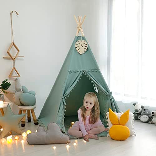 Foldable Teepee Tent for Kids Green Pompom Ball Design with Floor Mat,Carry Case,Banner,Four Ploes Classic Cute Children Playing House Indoor Outdoor Nursery Decor