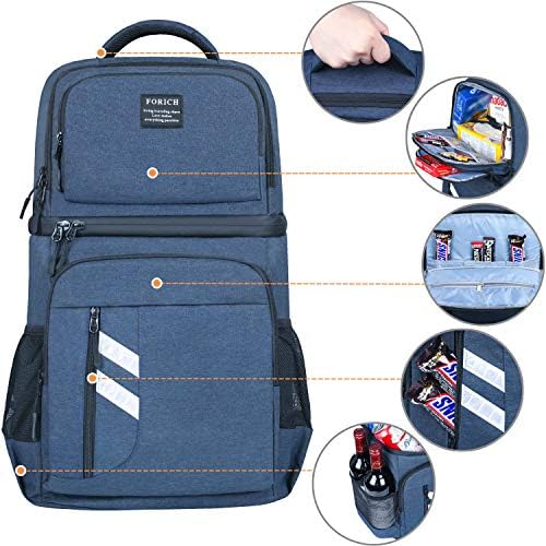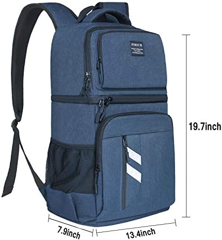 LARGE CAPACITY: Measures — 19.7” H x 13.4” L x 7.9” W. FORICH insulated cooler backpack is roomy enough to pack all your necessities, there is a main leak proof insulated cooler compartment for beer, drinks, ice pack, tall beverages, fruits. Also upper half is large enough for dry items, such as meals, snacks, guider book, cellphone and so on.