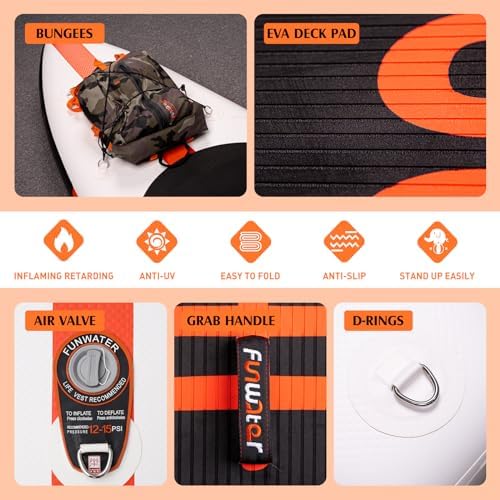 【Extra Wide Stable Design】Funwater paddleboard is 11′ long, 33″ wide and 6″ thick. It’s weight capacity up to around 360lbs and super-wide design ensures higher stability and flexibility, come complete with premium accessories, suitable for all skill Levels to enjoy themselves, explore, or adventure in water areas.