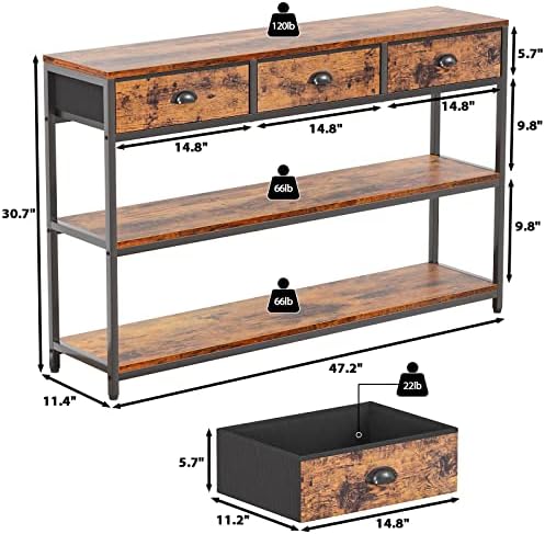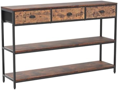 Furologee Long 47″ Console Sofa Table with 3 Drawers, Entryway Table with 3-Tier Storage Shelves, Industrial Display Shelf for Entry Way, Hallway, Couch, Living Room, Kitchen, Foyer, Rustic Brown