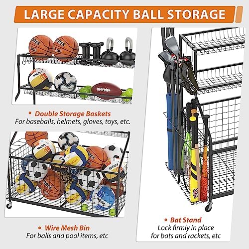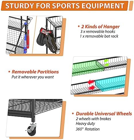 【🏀Larger Special Design Sports Storage System】Our sports equipment storage features 3 layers in total which include 2 large storage bin, 2 moveable middle basket, 1 bat rack with bottom basket, EXTRA 1 removable bat rack and 3 removable hooks. Easy to store all kinds of rolling balls like baseball, footballs, basketballs, volleyball; large equipment such as your indoor & outdoor sports items, bat racks, hockey racks and even your kids toys.