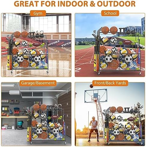 【🏈Multi-Functional for Many Occasions】The Rolling Sports Ball Basket features in 4 heavy-duty smooth rolling wheels, Indoor & Outdoor Design, which is easy to move the organizer anywhere and fits in a specific position. This versatile sports gear storage is ideal for garages, basement, gym, playgroup, game room, schools and kids room for better organization of your sports equipment and messy stuffs. No more chaos, only well-organized.