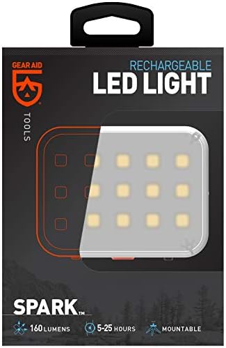 Smaller than a wallet and weighing less than a cell phone, the SPARK Rechargeable Light features 3, 000 mAh battery power, 15 ultra-bright white LEDs, and a drop- and splash-proof casing. Hang it, angle it, or mount it for 180 degrees of hands-free lighting for any task or adventure. It also comes with a storage bag that can be used as a light diffuser and hung for transforming the SPARK into a soft-glowing outdoor lantern. Great for setting up camp, building a fire, changing a tire, or using during a home power outage, the SPARK features a 5700k color temperature with three brightness settings — low, medium, and high — that range from 25 to 160 lumens of light power. It also includes an SOS feature for emergencies. The built-in Li-ion battery provides 5 to 25 hours of light (depending on brightness setting). Weighing 4 ounces, the SPARK is equipped with an aluminum kickstand that adjusts from 0-90 degrees. Featuring a splash-proof casing rated at IPX4, the SPARK is also drop-tested at two meters. It has a 1/4″-20 threaded point for mounting to tripods, as well as using Gear Aid, RAM, and GoPro mounts (GoPro adapter sold separately) for mounting on vehicles, racks, canopies, awnings, tables, and windows. It’s backed by a 1-year limited manufacturer’s . Gear Aid makes hard-working products that go the distance — glue that outlasts your boots, patches that never peel away, water repellents that work, and portable electronics that give light and power for days.