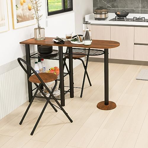 Giantex 3-Piece Bar Table Set – Counter Height Dining Table & 2 Foldable Chairs w/ 4-Tier Storage Shelves, Anti-Toppling Device, Breakfast Dinette Furniture, Space-Saving Dining Set for Kitchen Bar