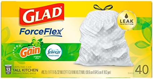 Glad Trash Bags, ForceFlex Tall Kitchen Drawstring Garbage Bags‚ 13 Gallon White Trash Bag, Gain Original scent with Febreze Freshness‚ 40 Count (Package May Vary)