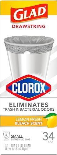 Glad and Clorox have joined forces to create a trash bag with the strength of Glad and the odor-fighting power of Clorox. Glad with Clorox Small Drawstring Trash Bags eliminates trash and bacterial odors on the bag to help keep your home feeling fresh and healthy. These 4 gallon garbage bags fit small size trash cans and are ideal for bathrooms, bedrooms, offices, nurseries and laundry rooms. Featuring a grey bag and printed hexagon design on the hem of the bag, these trash bags add a design detail to any room when they are folded around the edge of the can. Just a quick cinch of the durable drawstring makes trash removal simple. These versatile trash bags feature the clean smell of Lemon Fresh Bleach Scent. Glad with Clorox garbage bags work as hard as you do to help maintain a fresh and healthy feeling home with a versatile design for bins around the home. Glad 4gal bags are comparable to Simplehuman A, B, C, or R trash bags*. *Simplehuman is a trademark of Simplehuman, LLC. Glad is not sponsored by or affiliated with Simplehuman.