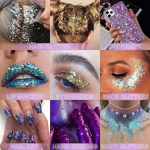 ✨Multiple Uses – Chunky glittery paste can be use around eyes, on lips, face, hair, nails,collarbones highlight, shoulders and other body parts. And you can even use this to do DIY craft. Perfect for various occasions such as rave outfit accessories. banquets, weddings, singer concert,parties, performances, carnivals stages, bars , dating, celebration, ball, HALLOWEEN, costume, slime paint, music festival, or daily makeups and other venues for a super glittering effect.