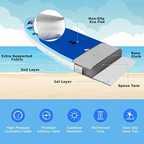 Super Durable Double Layer PVC — Goplus paddle board adopts double layer PVC and drop-stitch construction, which allow the surfboard withstand a lot of pressure without deforming or bursting. The EVA has good friction, which will prevent user from sliding. It’s sturdy and safe for long time use. Use latest inkjet technology, anti-fading, anti-yellowing.