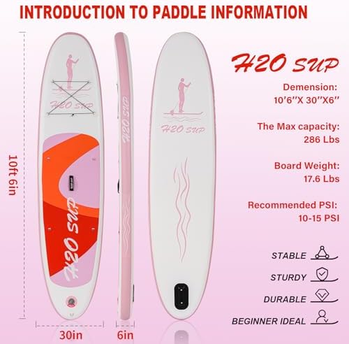 H2OSUP Inflatable Stand Up Paddle Board 10’6”/10′ × 30″ × 6″ with Premium SUP Paddle Board Accessories & Backpack, Ultra-Light, Wide Stable Design, Non-Slip Deck for Youth & Adults