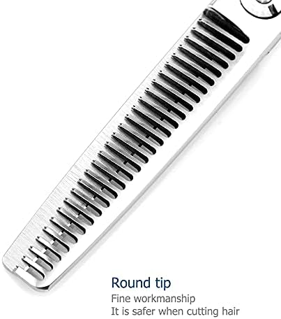 Features: 440C convex blades,very sharp and can keep sharp during long working life.Professional 28 V teeth thinning shears,thinning rate 25%-30%.Well-proportioned honed edge line and slide way,very well cutting balance.Japan ergonomic handles design,reduce fatigue when use long time.The scissors blade body is forged,and the strength is better than that of laser cutting scissors blade body.