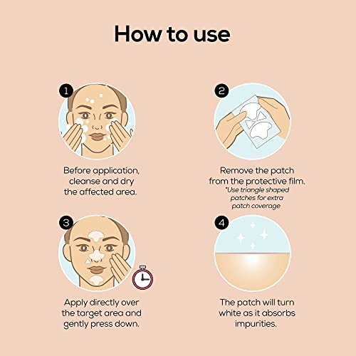 Painless peel compared to traditional nose pore strip Use the nose patch on the nose, forehead, chin, and even cheeks Use the small triangle acne patches around lips, eyebrows, and nose Use the hydrocolloid nose patch to treat pimples along the t-zone area Nose patch for blackheads that absorbs gunk and oil for clearer pores Clogged pore treatment and acne coverup