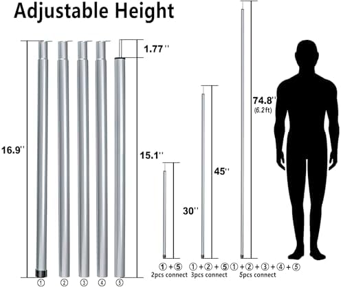 Each Section is 16.9 inches long, 0.75″ in diameter,thicker than others,large adjustable range from 30 to 74.8 inches with 5 sections.Easy to add or remove sections to meet your needs.