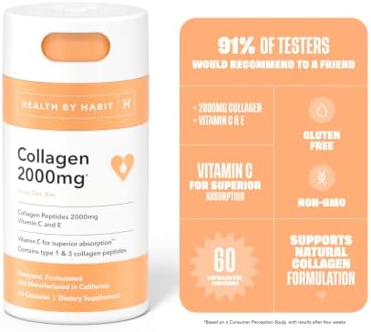Health by Habit Collagen Supplement (60 Capsules) – Vitamin C & Vitamin E, 2000mg, Collagen Peptides, Superior Absorption, Support Your Skin, Non-GMO, Sugar Free (1 Pack)