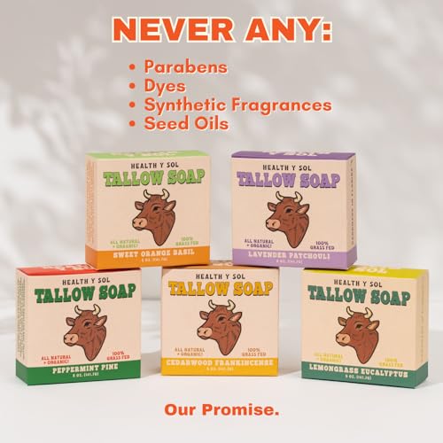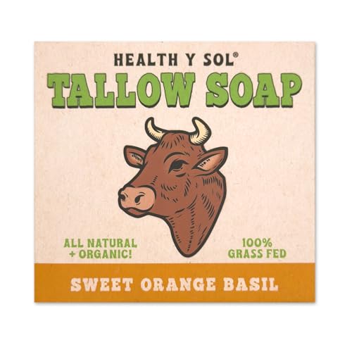 Health y Sol Tallow Soap 5 Pack, Grass Fed & Finished, Organic Olive Oil, Organic Coconut Oil, Handmade in USA, Palm Oil Free, Soap for Face Body Hands (Sweet Orange Basil)