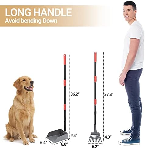 Pooper Scooper Equipment in Pack: 1 tray and 1 rake kit meet almost all the needs of using. The size is over 37 inches, you need not bend over when clean pet poop.