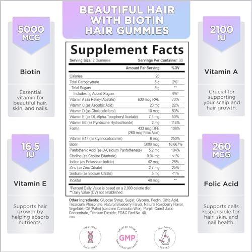 Hair Gummy Vitamins: Hair Gummies provide nutrition to help support a foundation for longer, stronger, more beautiful looking hair; With these biotin gummies, you don’t need to worry about swallowing capsules or dealing with negative side effects such as digestive upsets