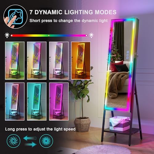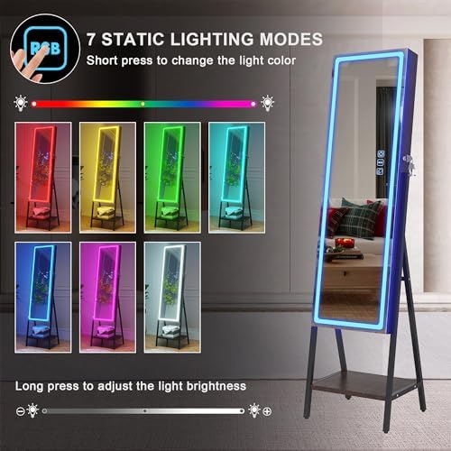 🎁 【Standing Full Body Mirror with RGB Lights】 Modern frameless HD jewelry mirror, providing you with plenty of makeup and shine, is the best choice for the best way to go out. 7 dynamic lights, 7 static lights, adjustable brightness
