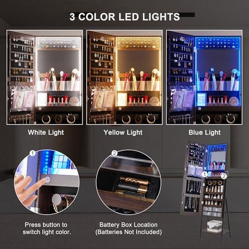 HNEBC RGB LED Mirror Jewelry Cabinet,Standing Jewelry Armoire Organizer Full Length Mirror with Storage, Lockable Jewelry Mirror for Women’s Christmas Gift, 14 Lighting Modes (RGB-Brown)