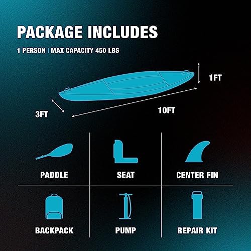 EVERYTHING YOU NEED: Our feather lite kayak comes with a dual-action hand pump for easy inflation as well as a heavy-duty backpack for convenient transportation and storage. You can easily pack up your inflatable kayak and take it on your next adventure.